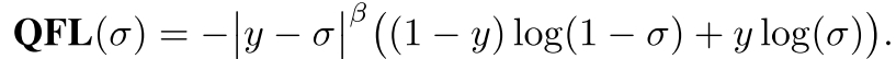 위와 같이 기존 Focal Loss 에서 Cross Entropy 의 -log(pt) 를 complete version 인 -((1-y) log(1-σ) + y log(σ)) 로 확장하였으며 Scaling factor 의 (1-pt)^Γ 를 estimation σ와 continuous label y 의 L1 distance |y-σ|^Β 로 대체하였다. 또한 Multi-class implementation을 위하여 sigmoid 연산자 σ 로 multiple binary classfication 을 적용하였다.