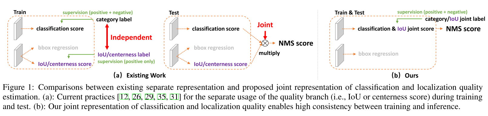 그림 1-(a)에서와 같이 최근 dense detetor에서 localization quality estimation 및 classification score는 일반적으로 독립적으로 훈련되지만 inference 할 때에는 각 branch의 결과 값이 joint 되어 NMS score 를 계산하게 된다. 따라서 논문에서는 이러한 일관적이지 않은 방식을 문제점으로 삼아 train 및 inference 과정 모두에서 localization 및 classification score 들을 joint 해줌으로써 둘 사이의 상관성을 매우 강하게 갖도록 유도한다. 이는 end-to-end 방식으로 학습 할 수 있으며 train 및 test 의 불일치를 제거하고, localization score 와 classificaion score 간에 강렬한 상관 관계를 가질 수 있다.