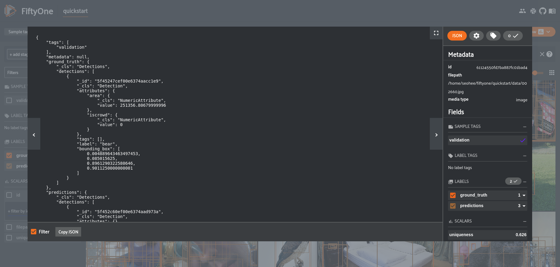웹을 통해 아래와 같은 화면이 제공되고, quickstart 프로젝트를 통해 약 200개의 샘플 데이터들을 확인 할 수 있다. 모든 데이터들의 주석은 json 으로 이루어져있다. COCO 형식 말고도 VOC, YOLO 형식 등을 지원한다. 그리고 아래 화면은 prediction 된 박스(갈색)와 ground thruth의 박스(주황색)을 제공한다.