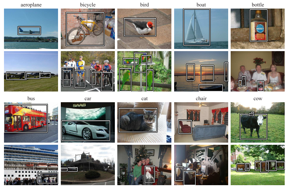 다음 그림 2는 VOC2007 데이터 세트에서 20개의 클래스를 보여줍니다. 그림에서 볼 수 있듯 클래스는 vehicles, animals, household objects 및 peoples 의 네 가지 주요 객체로 나눠집니다.
