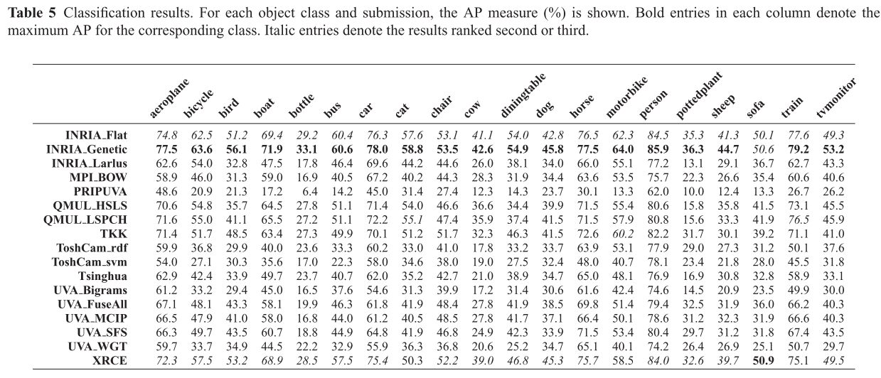 2006 10 classes: bicycle, bus, car, cat, cow, dog, horse, motorbike, person, sheep. Train/validation/test: 2618 images containing 4754 annotated objects. Images from flickr and from Microsoft Research Cambridge (MSRC) dataset The MSRC images were easier th