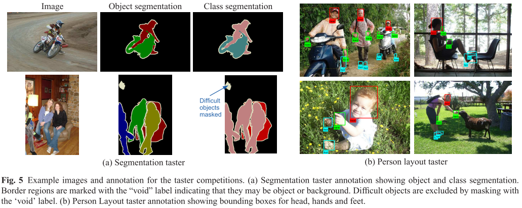 person layout 챌린지의 경우 각 주요 데이터 세트에 있는 "person" 객체의 하위 집합에 사람의 2D 포즈 또는 "layout"에 대한 정보가 주석이 됩니다. 각 사람에 대해 머리, 손, 발 세가지 유형의 "part"에 경계 상자가 추가 됩니다. 그림 5b 를 보시면 됩니다. 이는 사람의 전반적인 자세에 대한 좋은 근사치를 제공하기 위해 선택되었다고 합니다.