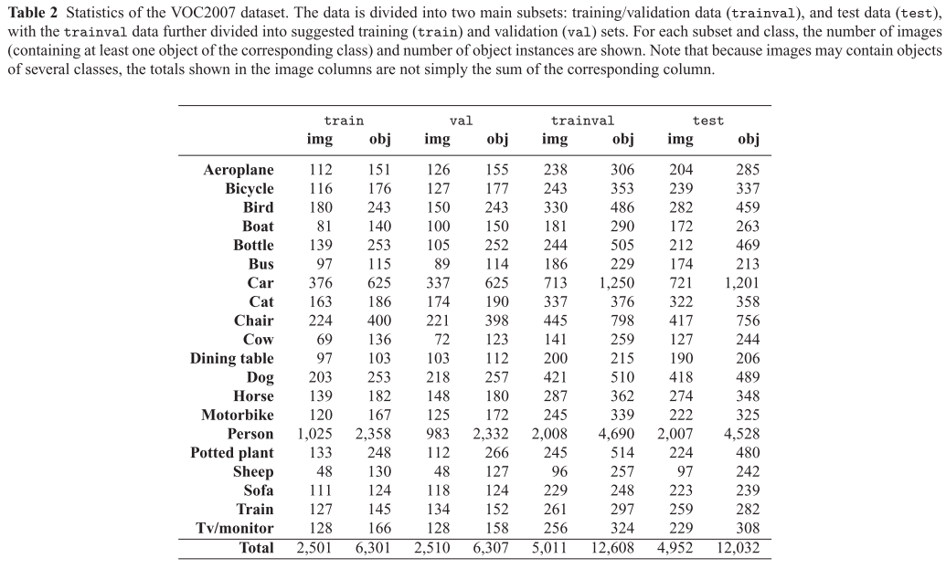 다음 표는 VOC2007 데이터 세트의 통계를 요약해두었습니다.