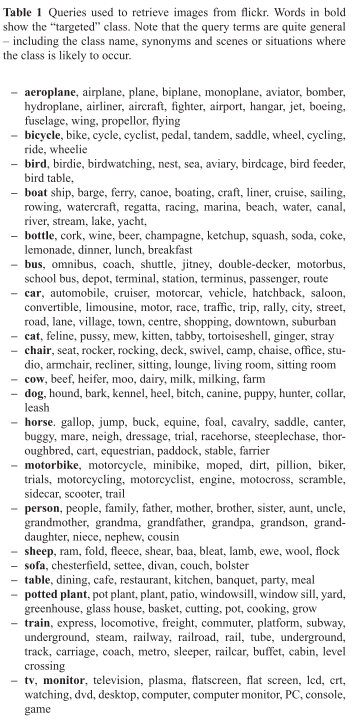 또한 이미지 수집 과정에서 한 가지 작은 편향이 발견되었는데 "recency" 순으로 순위가 매겨진 쿼리 결과를 사용했는데, 그 당시 2007년 1월에 수집이 진행되어 크리스마스 트리가 포함된 겨울 이미지 수가 많았다고 합니다. VOC2008에서는 이러한 편향을 피하기 위해 키워드와 함께 임의의 날짜를 포함하는 쿼리를 이용하여 이미지를 검색했다고 합니다. 상당히 흥미롭네요. 우리나라에서 이미지를 수집 할 때는 사계절 별로 나눠서 수집하면 좋을 듯 합니다.