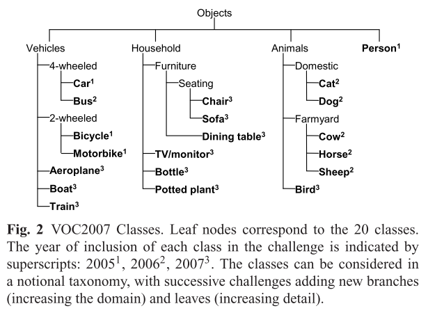 또한 특정 클래스가 포함된 챌린지 연도를 보여주기도 하네요. VOC2005 챌린지에서는 4가지 클래스(자동차, 오토바이, 자전거 및 사람)에 주석이 추가되었고, VOC2006에는 클래스의 수가 10으로 VOC2007에는 20으로 증가했다고 합니다. 추후 데이터 세트는 더 미세하게 "sub-classes"가 추가 되었습니다. sub classs를 나누는데 있어서 먼저 "semantic"한 요소를 고려했다고 합니다. 예를 들면 다양한 유형의 차량을 인식하는 것과 같이 자동차/오토바이(시각적으로 유사하지 않을 수 있음), 시각적으로 유사한 것으로 간주될 수 있는 객체(e.g. cat 과 dog)를 포함하여 recognition 의 작업 난이도를 높였습니다. 그 다음으로는 notional taxonomy를 고려하여 나누었다고 합니다. VOC2006 에서는 animals 이 추가되었고, VOC2007에서는 household objects 가 추가되었다고 합니다.
