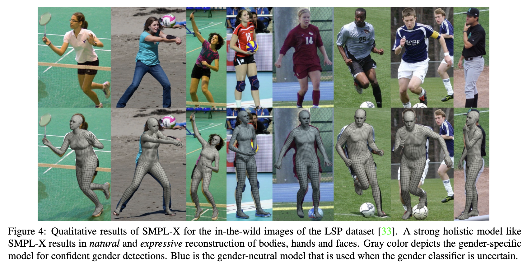 SMPL-X 모델은 기존 SMPL 모델(손이나 얼굴에 대한 detail이 떨어지는)에서 확장된 모델이다. 대량의 3D scan data로부터 얼굴과 손까지 포함한 새로운 body model을 구성하였다. 즉, 3가지 모델을 통합하였다.