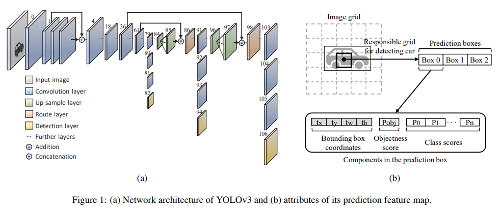 위 그림 1b에서 YOLOv3 의 예측된 특징 맵은 그리드 당 3개의 예측 박스를 가지며, 각각의 예측 박스는 tx, ty, tw, th 의 Bounding box coordinates 로 나타나고, 객관성 점수? 신뢰 점수를 나타내는 Objectness Score, 그리고 클래스 점수 Class Scores 를 뿜게 된다. 그 다음 이 두 값의 곱을 기반으로 객체를 감지한다. Objectness 및 Class 정보와는 달리 예측 박스 좌표들은 점수 대신 좌표 값을 뿜게 되므로 bbox 의 신뢰도를 알 수 없다는 한계를 가진다.