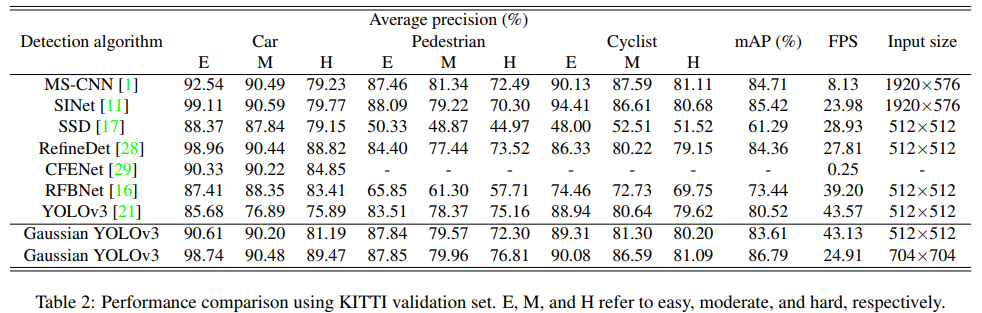 기존 YOLOv3 에 비하여 Gaussian YOLOv3 알고리즘은 KITTI 및 BDD 데이터 셋에서 mAP 를 각 3.09 및 3.5 만큼 향상시켰다. 그럼에도 불구하고 제안된 알고리즘은 초당 42 프레임 보다 빠른 속도로 실시간 검출이 가능하며, 이전 접근 방식보다 정확도가 높다.