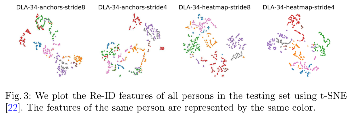 - 또한 아래 그림 3에서 다양한 모델로 학습한 Re-ID 특징을 시각화 하였다. 특히 stride 4인 경우의 anchor-based 접근 방식은 서로 다른 ID의 특징이 혼합되어있음을 볼 수 있다.