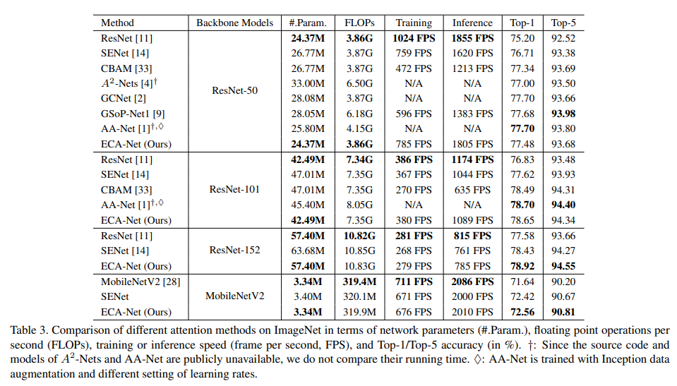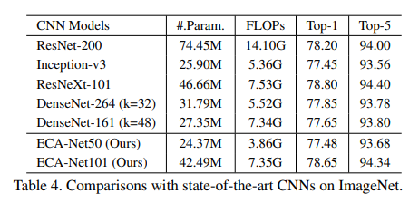 아래 표를 보면 ECA-Net 이 parameters 수 대비 성능 향상 폭이 매우 큰 것을 확인 할 수 있다.