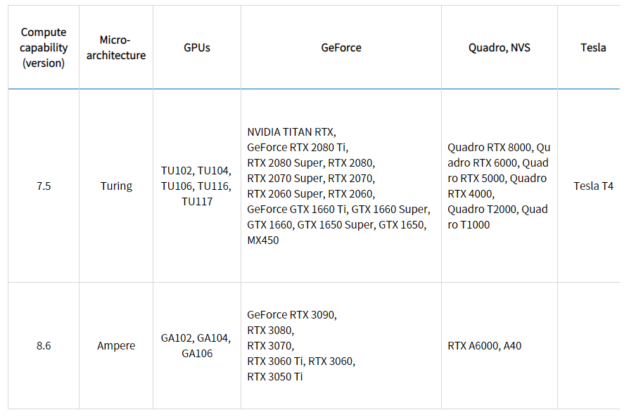 - CUDA SDK 11.0 – 11.2 support for compute capability 3.5 – 8.6 (Kepler (in part), Maxwell, Pascal, Volta, Turing, Ampere)[33] New data types: Bfloat16 and TF32 on third-generations Tensor Cores.[34]