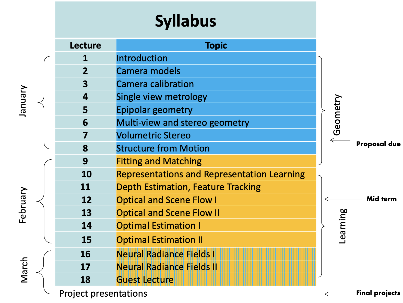 위 강의는 컴퓨터 비전 내용 중에서도 주로 geometry와 3D에 관련된 내용들을 다룬다. 코스는 아래와 같이 구성된다.