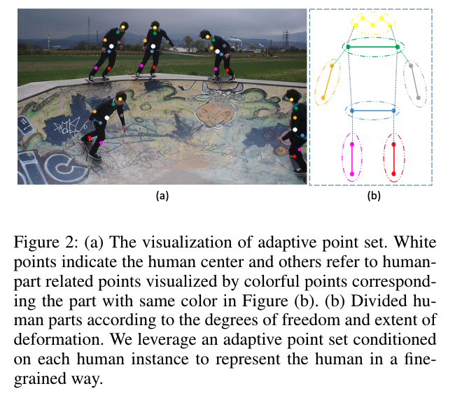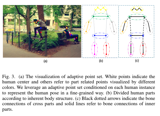 흰색 점은 human center를 나타내고, 나머지는 다른 색상으로 나타냈으며, 각 instance에 조건을 부여한 adaptive point set을 활용하여 human pose를 세밀하게 표현합니다. 신체 구조에 따라 human part를 나누고, 검은색 점선 화살표는 십자 부분의 bone connection을 나타내고, 실선은 innerpart의 bone connection을 나타냅니다.