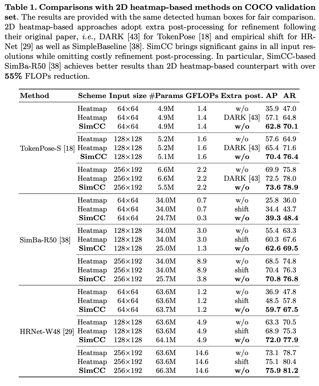 SimCC 기반 방법은 다양한 입력 크기(64×64, 128×128, 256×192, 384×288)에서 heatmap 기반 방법보다 쉽게 성능이 우수합니다.