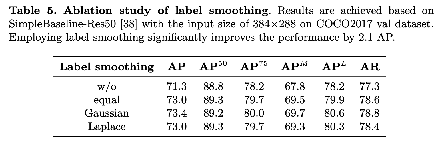 Label smoothing은 모델의 성능을 향상시키기 위해 자주 사용하는 기법인데, 본 논문에서는 equal label smoothing을 사용합니다. 이는 인접한 label의 공간적 관련성을 고려하지 않고 false label을 무차별적으로 고려하지 않게 됩니다. 출력 범주가 GT에 가까울 수록 좋기에 이러한 문제를 해결하기 위해 Laplace 또는 Gaussian label smoothing을 사용하여 해당 분포를 따르는 smoothed label을 생성합니다.