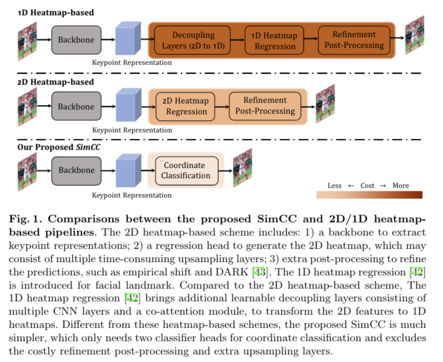2D heatmap 기반 방식은 keypoint representation을 추출하기 위한 backbone과 upsampling layer로 구성될 수 있는 2d heatmap을 생성하기 위한 regression head, 그리고 emprical shift 및 DARK와 같은 예측 결과를 개선하기 위한 post-processing으로 구성됩니다. 2D heatmap 기반 regression 방식은 facial landmark를 위해 도입되었는데, 2D heatmap 기반 방식과 비교하여 1D heatmap regression 방법은 2D를 1D로 변환하기 위한 여러 CNN layer와 co-attention module로 구성된 decoupling layer로 구성되어있습니다. 이러한 방법과 달리 SimCC 방법은 좌표를 분류하기 위한 2개의 classifier head 만 필요하고, post-processing은 필요가 없습니다.