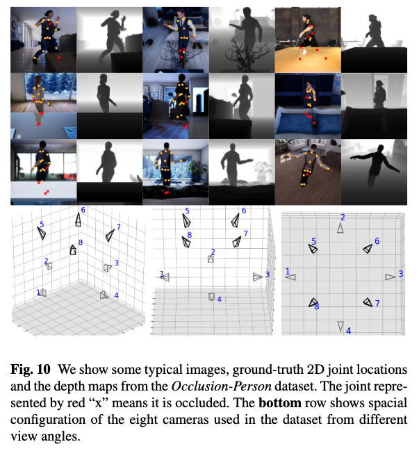 아래 그림을 보시면 occluded joint를 빨간색으로 표시해두었습니다. 이러한 데이터를 만들기 위해서 UnrealCV 방법을 이용하여 3d 모델에서 multiview image와 depth map을 추출합니다. 그 다음 서로 다른 옷을 입은 13명의 사람이 living room, bedroom, office에 배치됩니다. 그 다음 CMU Motion Capture database에 따라 pose들이 생성되고, joint를 일부러 가리기 위해 소파와 책상과 같은 object를 사용합니다. 그 다음 depth map을 렌더링 하기 위해 8개의 카메라가 배치되고(높이 0.9 and 2.3m, 반경 2m 원에 의해 45도 마다 배치됨), 15개의 3d joint를 생성합니다. 그 다음 occlusion label을 camera coordinate system의 3d joint와 depth map의 값을 비교하여 occlusion 여부를 판단합니다. 두 값의 차이가 30cm 보다 작으면 가려지지 않았다고 판단하게 됩니다.