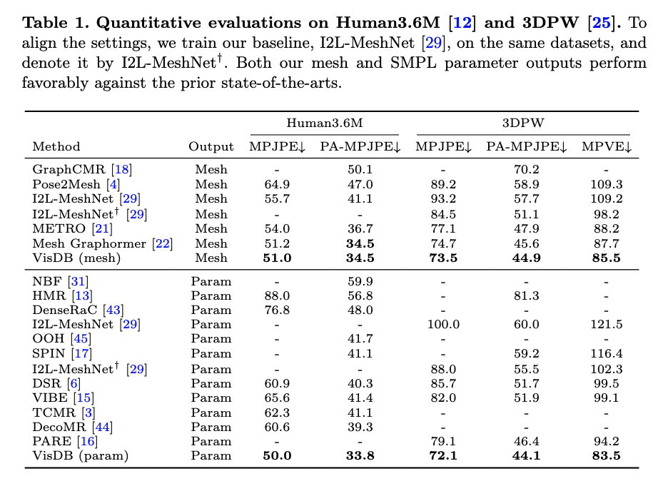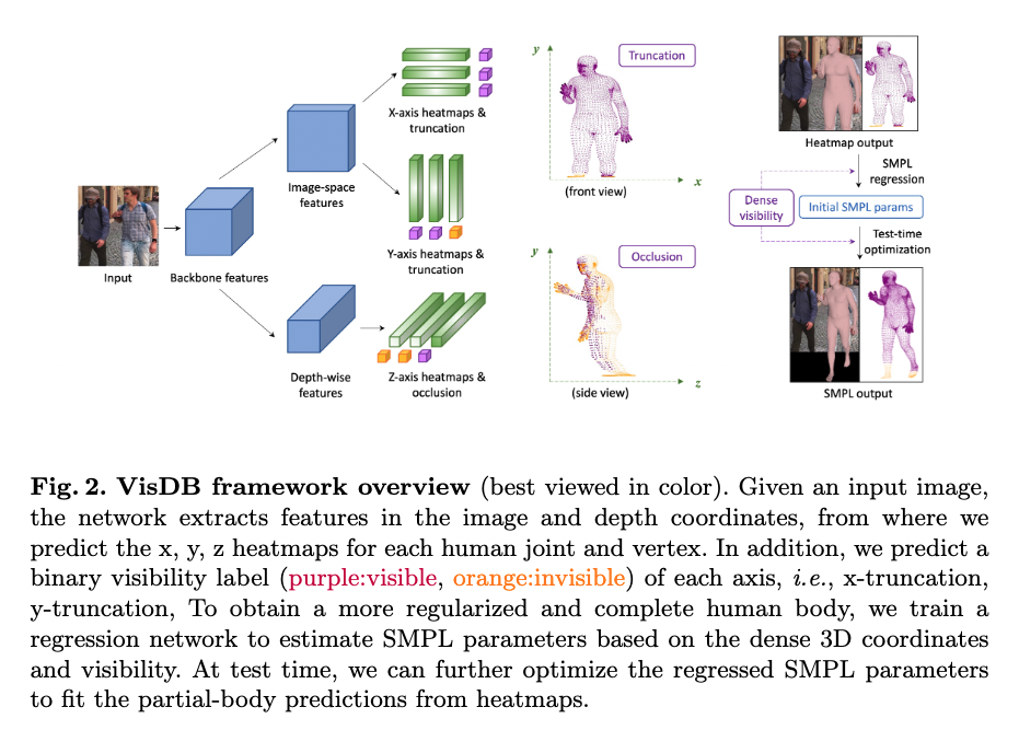 dense heatmap -based representation은 image domain에서 spatial-relationship을 보존하고, uncertainty of prediction을 보존할 수 있습니다. visible joint/vertics 의 위치를 파악하는데 효과적입니다. 하지만 x, y 축 heatmap은 image coordinate에서 정의되며, 프레임 외부에 나타나는 신체부위를 나타낼 수 없습니다. 또한 occlusion 같은 경우 ambiguty를 유발합니다. 그래서 어떤 joint가 보이는지 안보이는지 모른다면 모델 입장에서는 partial-body image에서 잘못된 출력을 생성하는 경향이 있습니다. 이를 해결하기 위해 본 논문에서는 VisDB(Visibility-aware Dense Body)를 제안합니다.