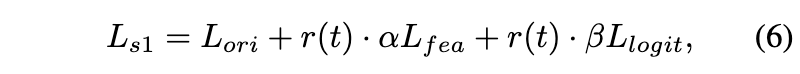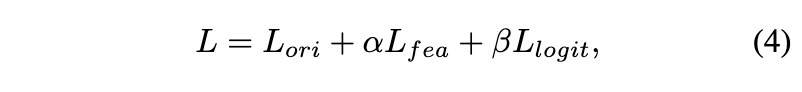 feature distillation loss $L_{fea}$와 logits distillation loss $L_{logit}$은 다음과 같이 조절됩니다. 여기서 알파와 베타는 하이퍼파라미터입니다.