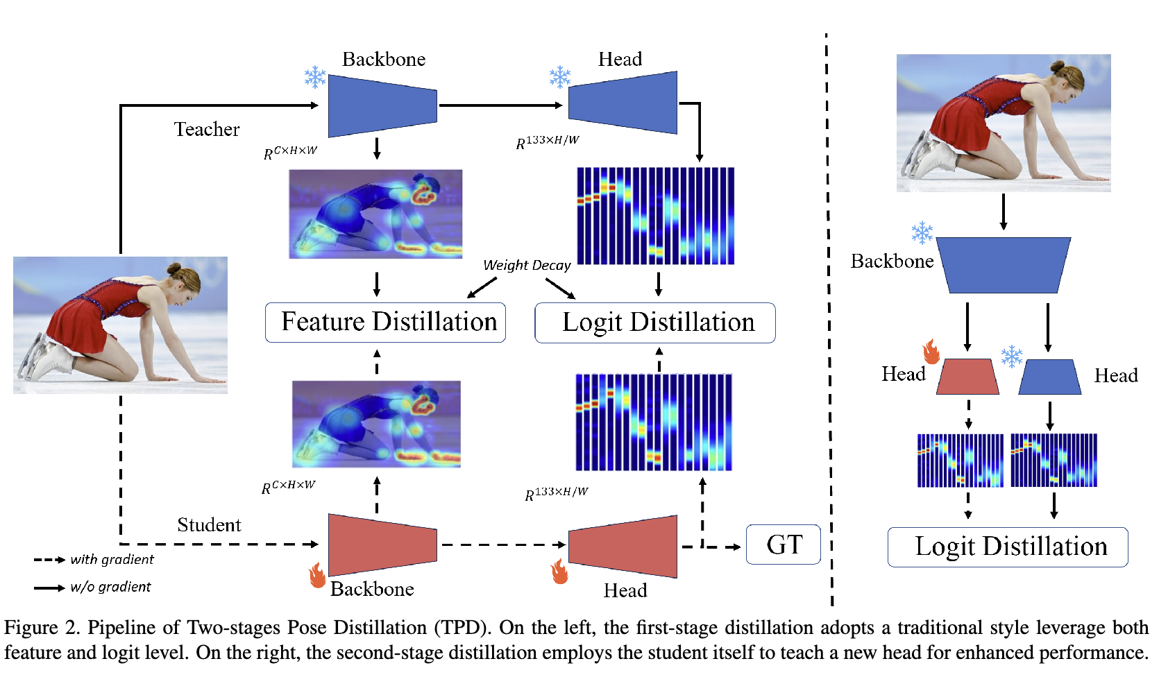 우선 논문에서는 two-stage pose distillation (TPD)에 대해 설명합니다. 아래 그림에서도 볼 수 있듯, 2가지 단계로 구성됩니다. 1단계에서는 feature 및 logit 수준에서 처음부터 student를 guiding 하는 pre-trained teacher가 있습니다. 그 다음 2단계에서는 self-KD 방식을 사용합니다. 자체 logit을 이용하여 레이블이 지정된 데이터 없이 head를 학습함으로서 간단하게 학습을 하되 상당한 성능 향상을 갖고옵니다.