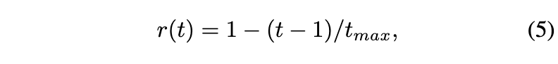 detection distillation 방법인 TADF에서 영감을 받아 distillation에 대한 weight-decay strategy을 적용하여 distillation penalty를 점진적으로 줄인다고 합니다. 이 전략은 student label에 더 집중하고 더 나은 성능을 달성한다고 하네요. 그래서 이를 위해 시간 함수 $r(t)$를 사용하게 됩니다. 여기서 $t$는 current epoch을 뜻하고 $t_{max}$는 total epoch을 뜻합니다.