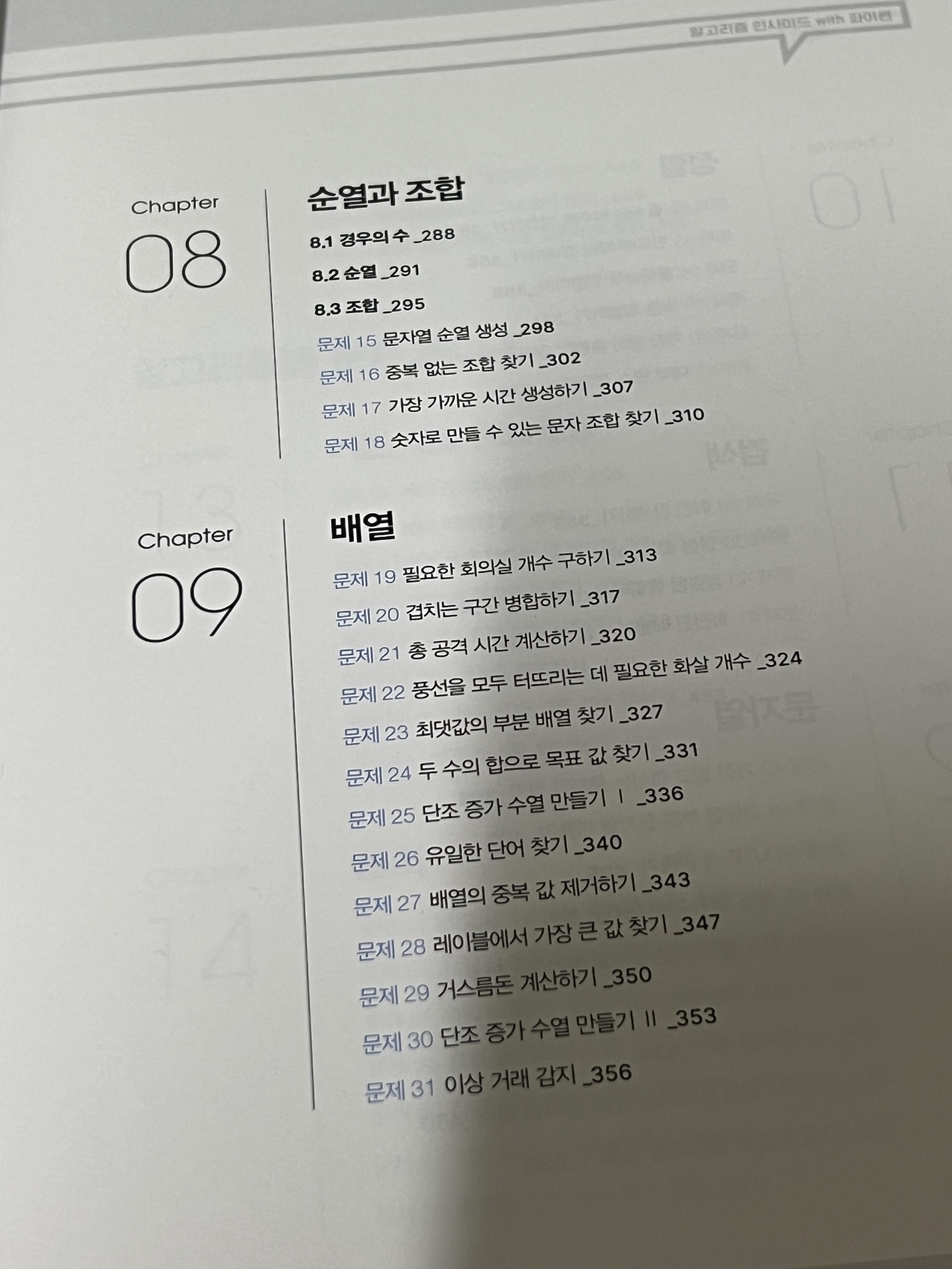 알고리즘 인사이드 with 파이썬 책은 한빛미디어에서 출간된 책이다. 역시 믿고 읽어보는 한빛미디어. 이 책은 알고리즘 문제 86개를 섹션 별로 나눠서 설명해놓은 책이다. 처음부터 끝까지 읽어보니 알고리즘에 대한 모든 것들을 꾹꾹 눌러 담은 책이라, 알고리즘 시험을 앞두고 있는 사람들에게 추천해주고 싶은 책이다. 첫 장에서 파이썬 기본 문법에 대해 간략한 설명부터 시작해서, 기본 자료구조에 대한 내용들도 담겨있으며, 재귀, 탐색, 공간, 배열, 순열 및 조합 정렬, 검색 등 알고리즘에서 필수적인 요소들을 다 담고 있다. 기본적인 문제 부터 풀기 때문에 파이썬 개발자가 아니더라도 쉽게 읽을 수 있는 책이라 진입 장벽이 낮아서 좋은 것 같다.