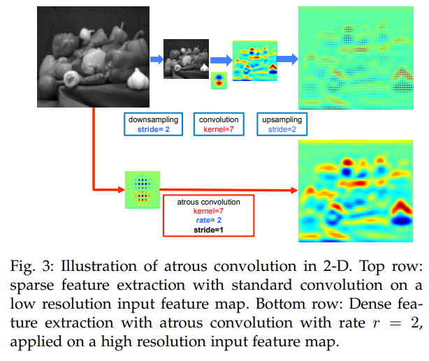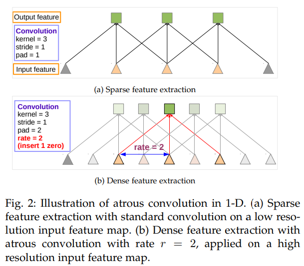 위 그림 (a)는 커널의 크기가 3인 기본적인 컨볼루션이다. 이와 달리 그림 (b)는 확장 계수(rate) 2가 적용되어 중간에 hole 이 1개씩 들어가게 되며, 똑같은 커널 사이즈 3을 사용하더라도 수용할 수 있는 영역의 크기가 커졌음을 확인 할 수 있다. 이 처럼 atrous convolution(dilated convolution)을 사용하게 되면 커널의 크기는 동일하게 유지하기 때문에 연산량은 동일하지만 receptive field 가 커지는 효과를 얻을 수 있게 된다.